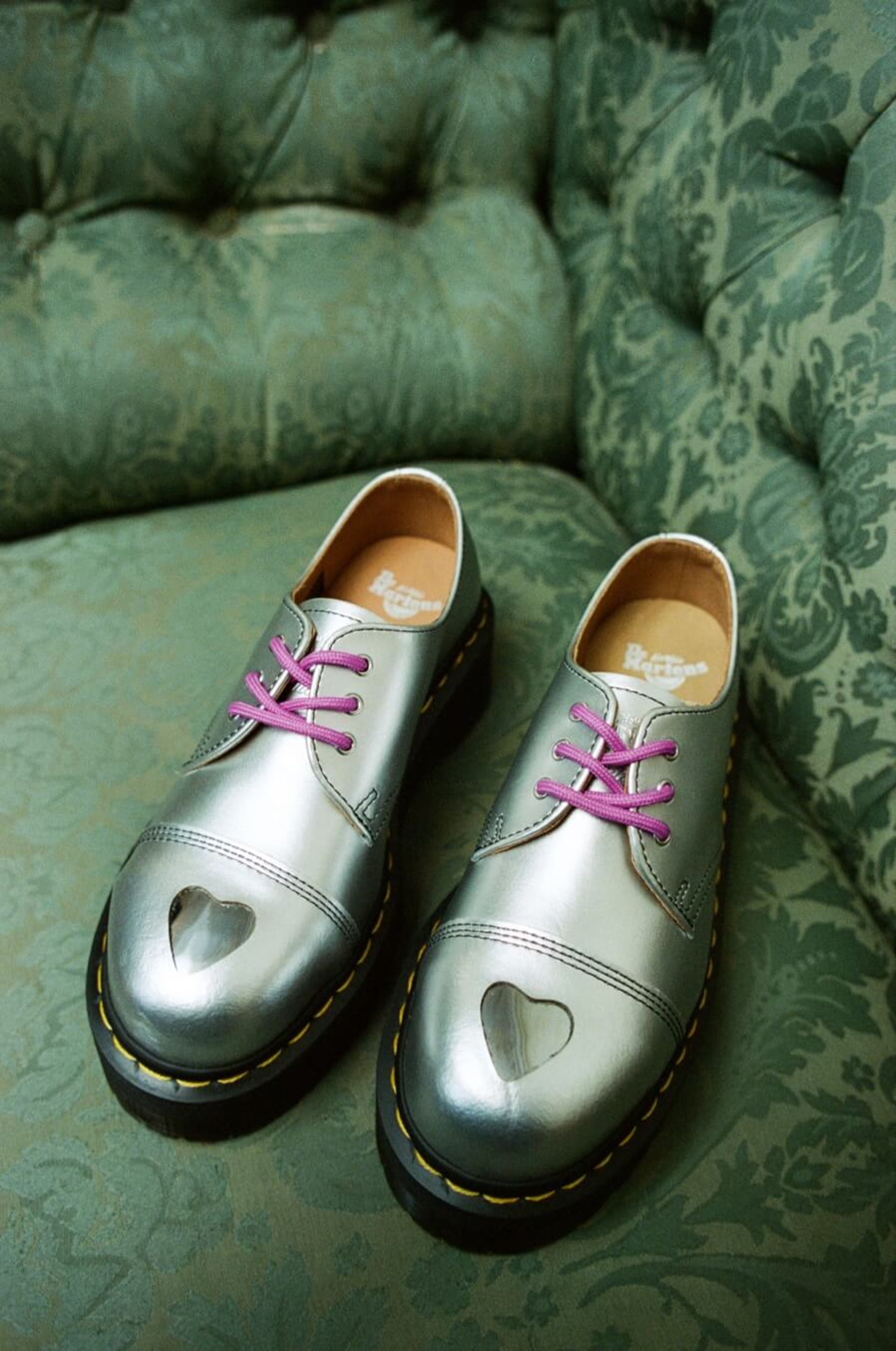 The two met IRL during the campaign shoot in London for the collaboration; the final product being a a 1461 3-eye shoe built on a Quad sole, featuring signature yellow welt stitching and an exposed steel toe capped in a heart-shaped cutout. “They're amazing, they're the right mix of my energy and [Erin’s] energy. They have such character,” says Lola.